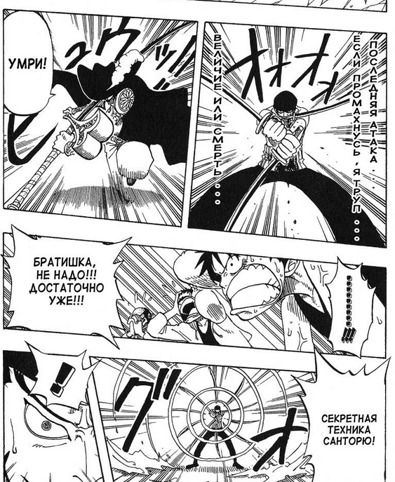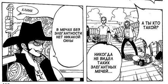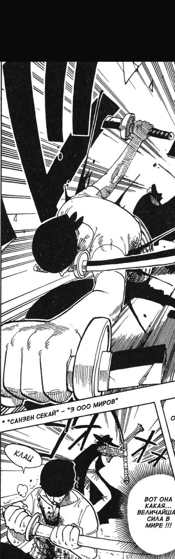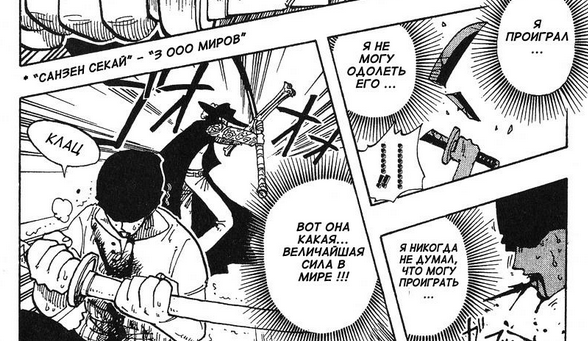 Вот прямо изображено все: Михоук собирается прирезать зоро, замахивается Зоро начинает исполнять финалочку Михоук охуевает, потеет и уходит в оборону тупо выставив перед собой меч плашмя Мечи Зоро ломаются потому что черный клинок пизже по грейду Зоро сдается