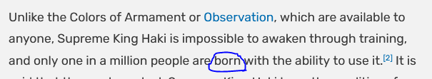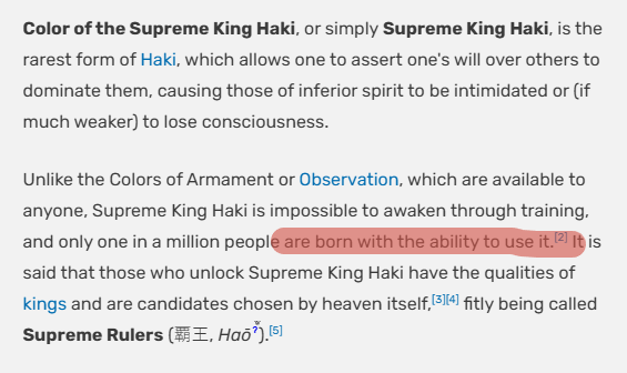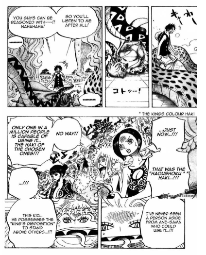 Наличие КВ у Эйса с детства. Наличие КВ у Катакури. Наличие крайне слабой КВ у Кида. Вот эти три момента не удобны для мнения, что КВ пробуждается когда ты становишься очень сильной личностью с большими амбициями и это доступно в теории любому. И наоборот, больше подтверждает, что она передается по наследству и ты можешь ее использовать без тренировок, амбиций, но в слабой версии.