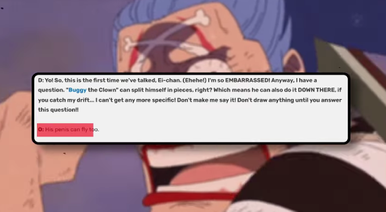 Тем временем Ода в СБС ссыт на ебала читателям. 1) Ходи Джонс имеет 2 члена. 2) Член Джимбея синий. 3) Член Багги может летать. В последних главах нужно внезапно раскрыть тему Шакки.