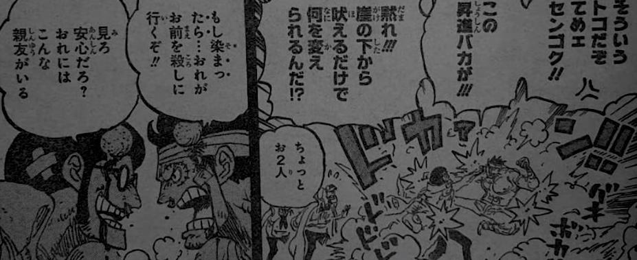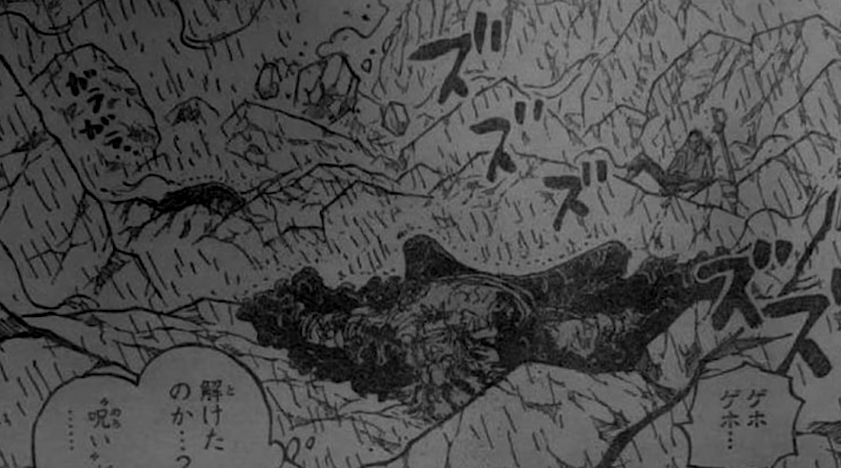 - Глава начинается с того, что Рокс лежит на земле (Роджер и Гарп уже покинули поле боя). Несмотря на атаки Роджера и Гарпа, Рокс был ещё жив и разговаривал сам с собой.
