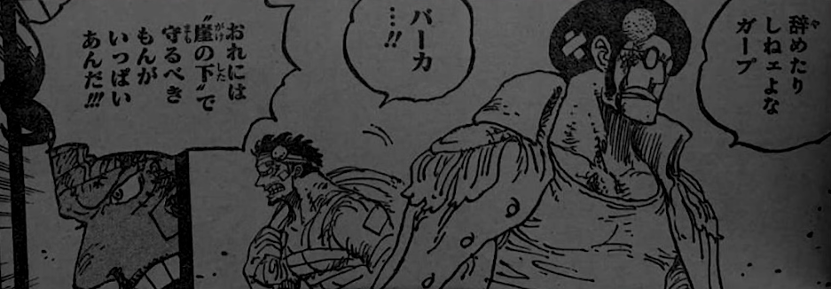 Гарп подрался с Сенгоку на тему того, что морской дозор прогнил. Как можно потакать этим мариджойским подонкам!1 Я больше ни секунду не останусь в этой помойке, как можно убивать рабов?11 Я ничего не знал!1 Там демоны наверху!1 Потом Сенгоку спрашивает Гарпа - Ну чё, всё уходишь из Дозора? А Гарп говорит - Не...