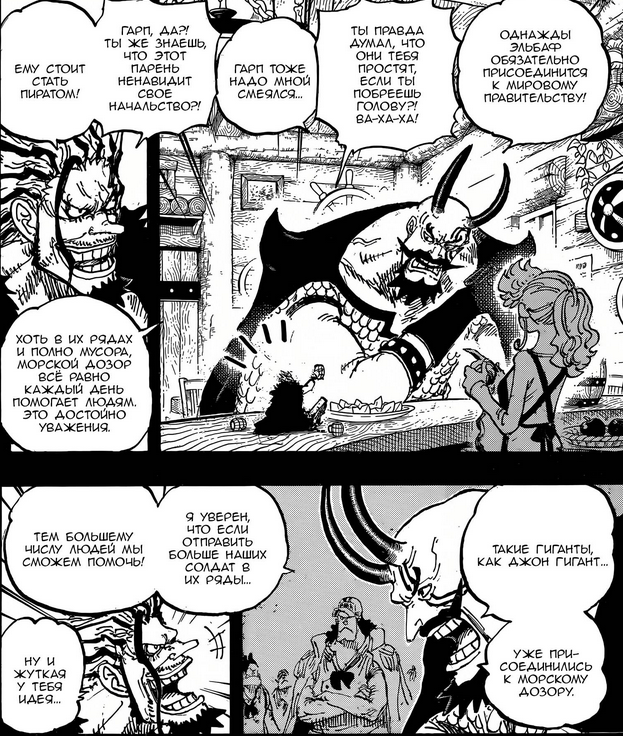 Я всё понял. Гарп на самом деле глава революционной армии. В последней главе он сказал, что не уйдёт из Дозора, потому что ему есть, что защищать. Он и без Дозора мог бы защитить свой родной остров. Дело в другом. Он всё это время был шпионом революционной армии и её главой. Он исполняет волю Д и эта миссия досталась ему от его отца. Он прикидывался дурачком, а сам сливал всю информацию по Дозору, Сворду, СП. Он в сговоре с Аокидзи, с которым они специально разыграли эту сценку на острове Тича. Гарп там настоящий мастермаинд.