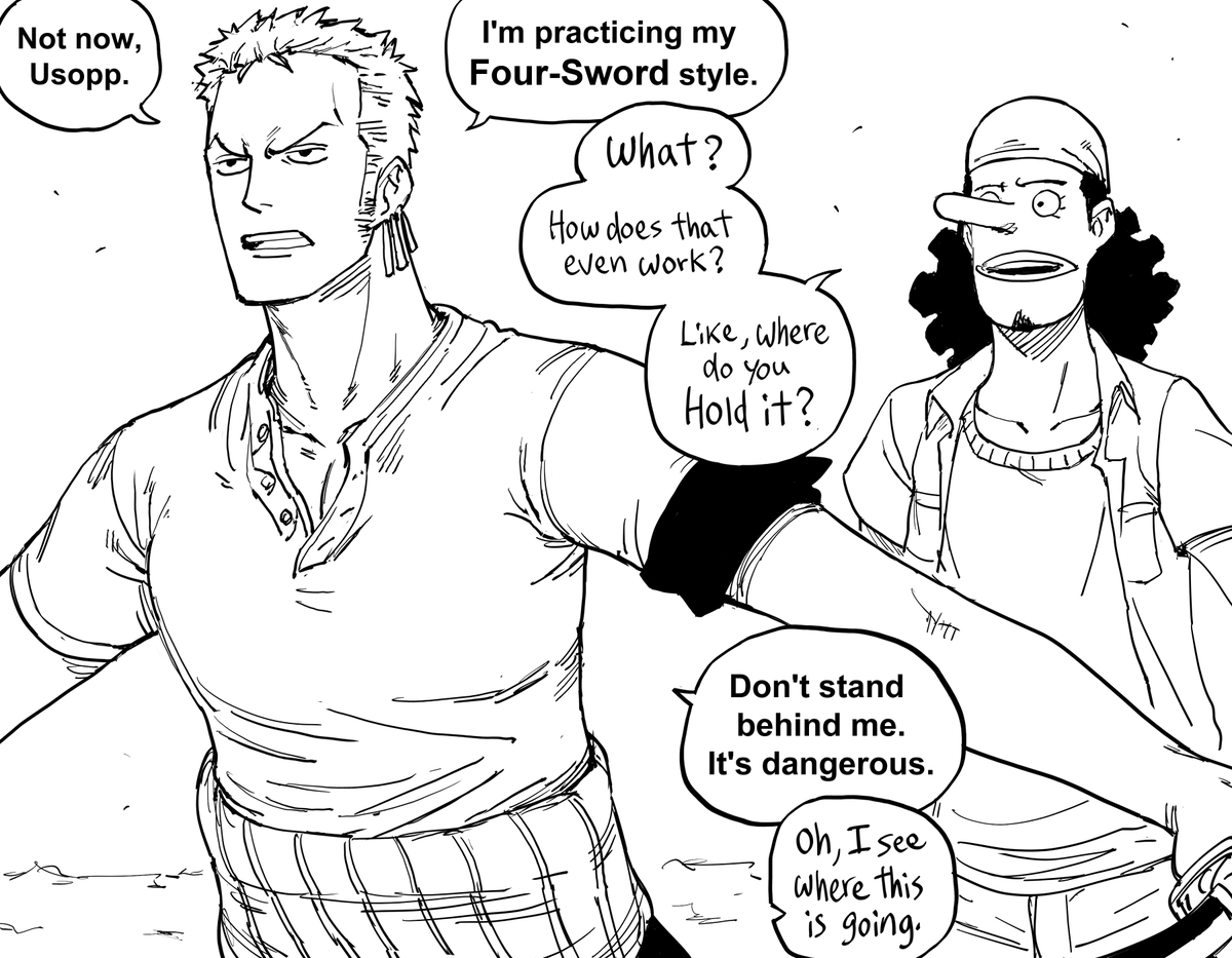 Короче фрукт Багги походу реально даёт тупо невосприимчивость к режущим атакам. Любым, любой природы и покрытые любой энергией. Супер контра мечников, как жалко, что сами мечники уже хуйня ебаная. Но если Зоро бы сожрал этот фрукт, можно было бы потом ходить и выёбывать, что он легендарный мечник, которого не сможет победить никакой другой мечник. Другой мечник бы попытался бить его тупыми атаками, но Зоро говорит - А всё, ты не клинком дерёшься, обосрался. Ты не настоящий мечник...