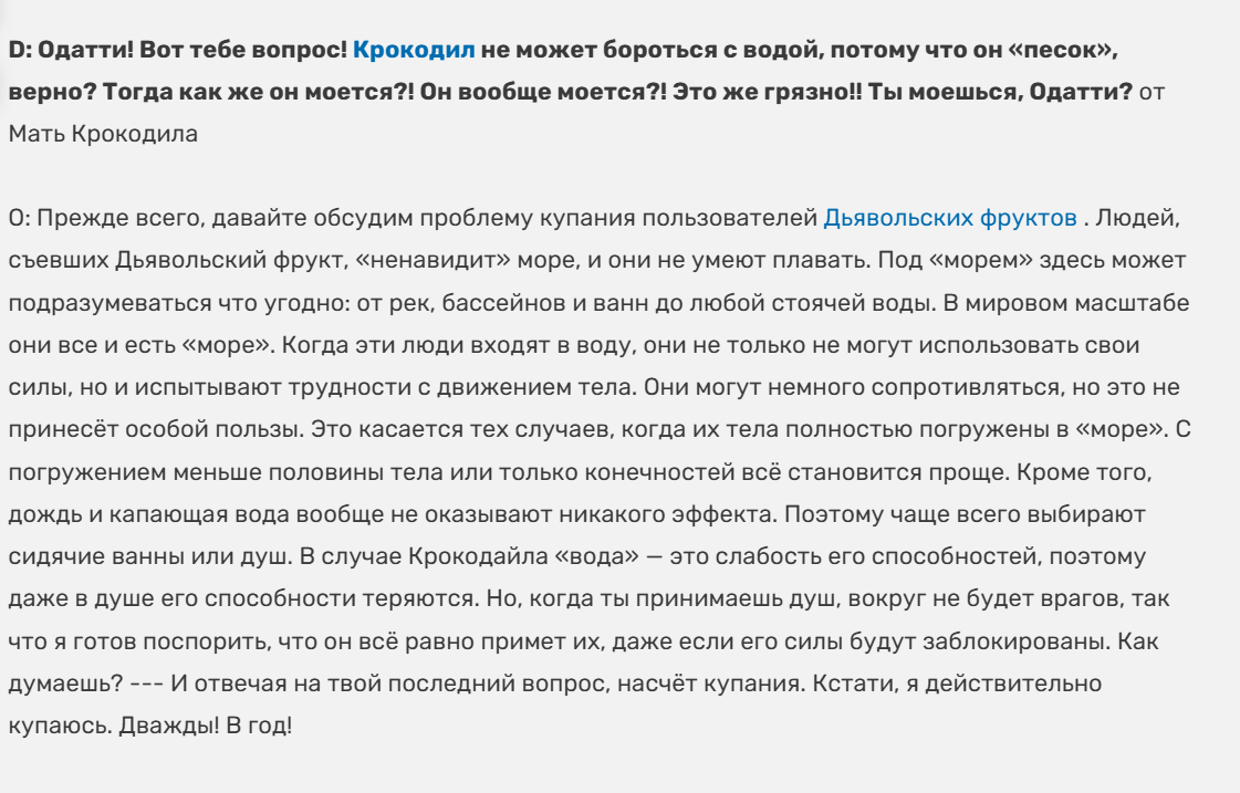 >>2471450 > Нахуя вообще способность плавать если ты становишься неуязвимым? Далее будут еще более имбовые фрукты, позволяющие персонажу превращаться в молнию/свет/драконов и т.д. И вот окажется что против всего есть контра, причем топовые челы её знают. А для менее мощных есть морской камень. Тронул фруктовика морским камнем и он теряет не только силу фрукты, но и физически становится слабее. А пчелика без фруктов и не сковать толком разве что бомбами обвесить которые взорвутся если попытается сбежать.