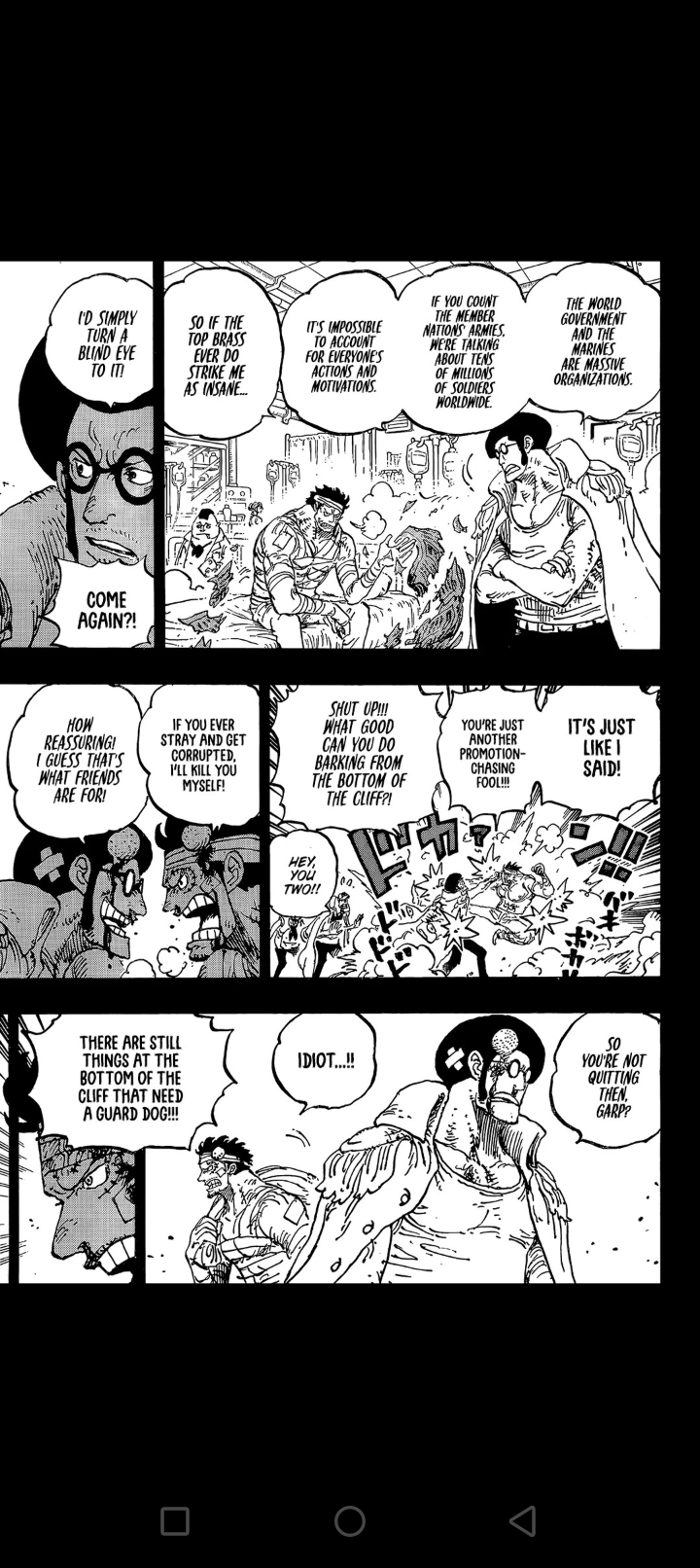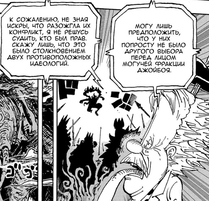 1. Небо снова раскололось на двое без стычки двух сильных королевских воль. Если ранее разделение неба от КВ одного это было не то чтобы редкость, то тут воли вообще не было. И не было лучей, как от орудия использующее пламя матери, потому что Вегапанк его еще не изобрел. 2. Лол. Все таки Гарпа даже не Сенгоку отмазал. Отмазало само правительство. Потому что Им не побеспокоился, что его атаковали с нулем урона. Муравей даже не укусил Бога, чтобы обратить его внимание на себя. Выгоду для себя правительство вынесло все же создав героя, что будет привлекать молодняк в ряды дозора.
