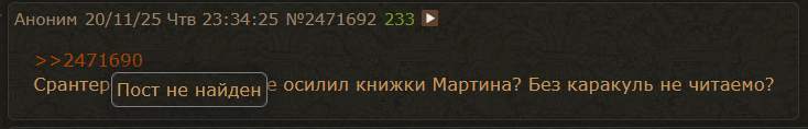 >>2472083 Кстати скуфные каловые дети, а чего вы именно здесь срете? Чем вам тут так нравится срать, а не в других тредах? У вас же уже был свой загон с атакой титанов, был загон с магической битвой. Там же у вас уже боевые картинки готовые, родной запах, хорошо и уютно насрано
