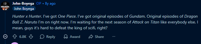 >>2471926 Аниме это пик синема же. У тебя уникальная возможность посмотреть сёнэн с которым ты не знаком, в котором уже тысяча серий. И там почти нет филёров. У нас такой возможности не было. Олды в тредисе закончили смотреть аниме когда оно ещё на Сабаоди только было. И потом только в онгоинге наворачивать можно было. Если бы был какой-то древний сёнэн который я не смотрел и к нему было аниме, я бы в последнюю очередь пошёл наворачивать эту хуйню чёрно-белую, где у раннего Оды ещё нихуя не понятно, что на страницах происходит из-за излишнего количества деталей.