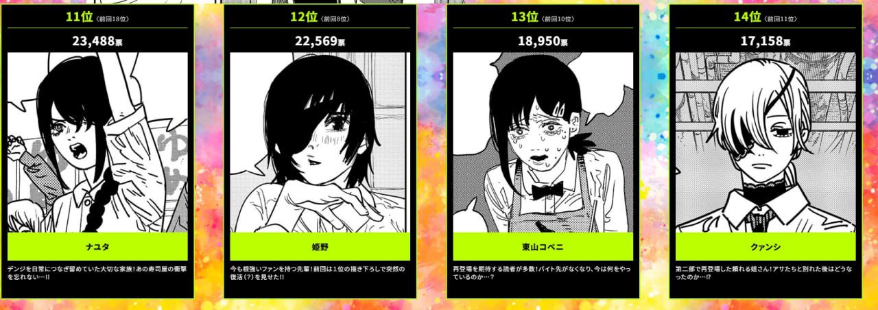 Стоп, то есть из каста второй части узбек занял второе место? Ору нах Как же Фудзимото обосрался с продолжением, если такой не раскрытый перс приманка обошёл всех Денджи можно даже не считать т.к он главный герой и выйдет легитимный топ 1 двушки в виде демона гомосятины