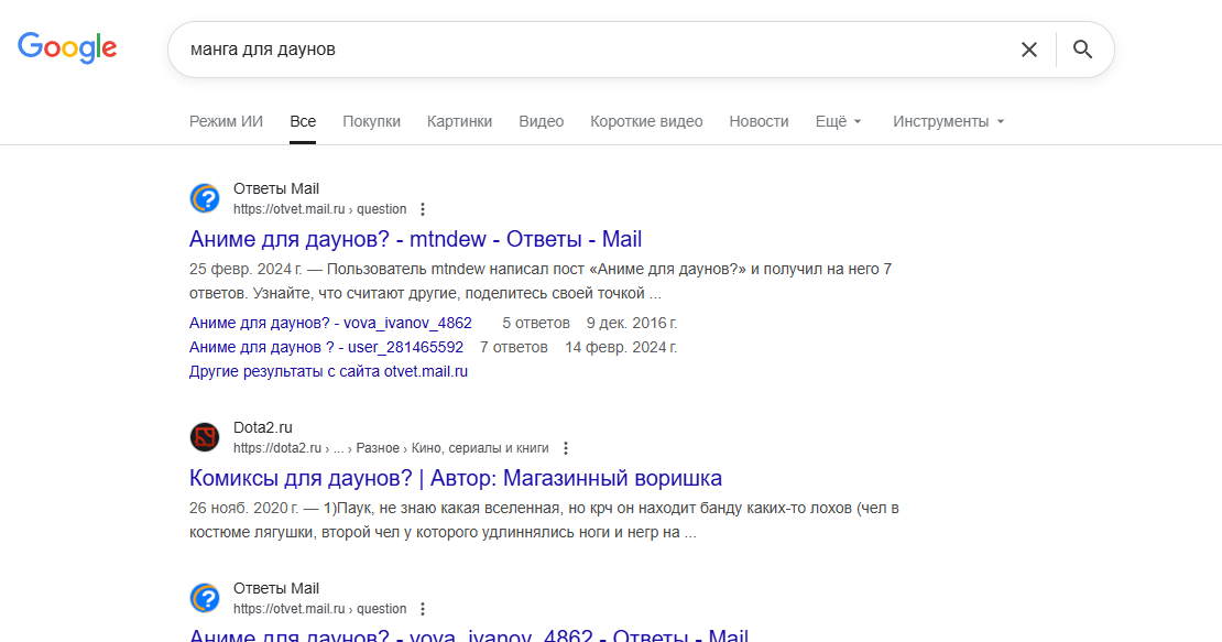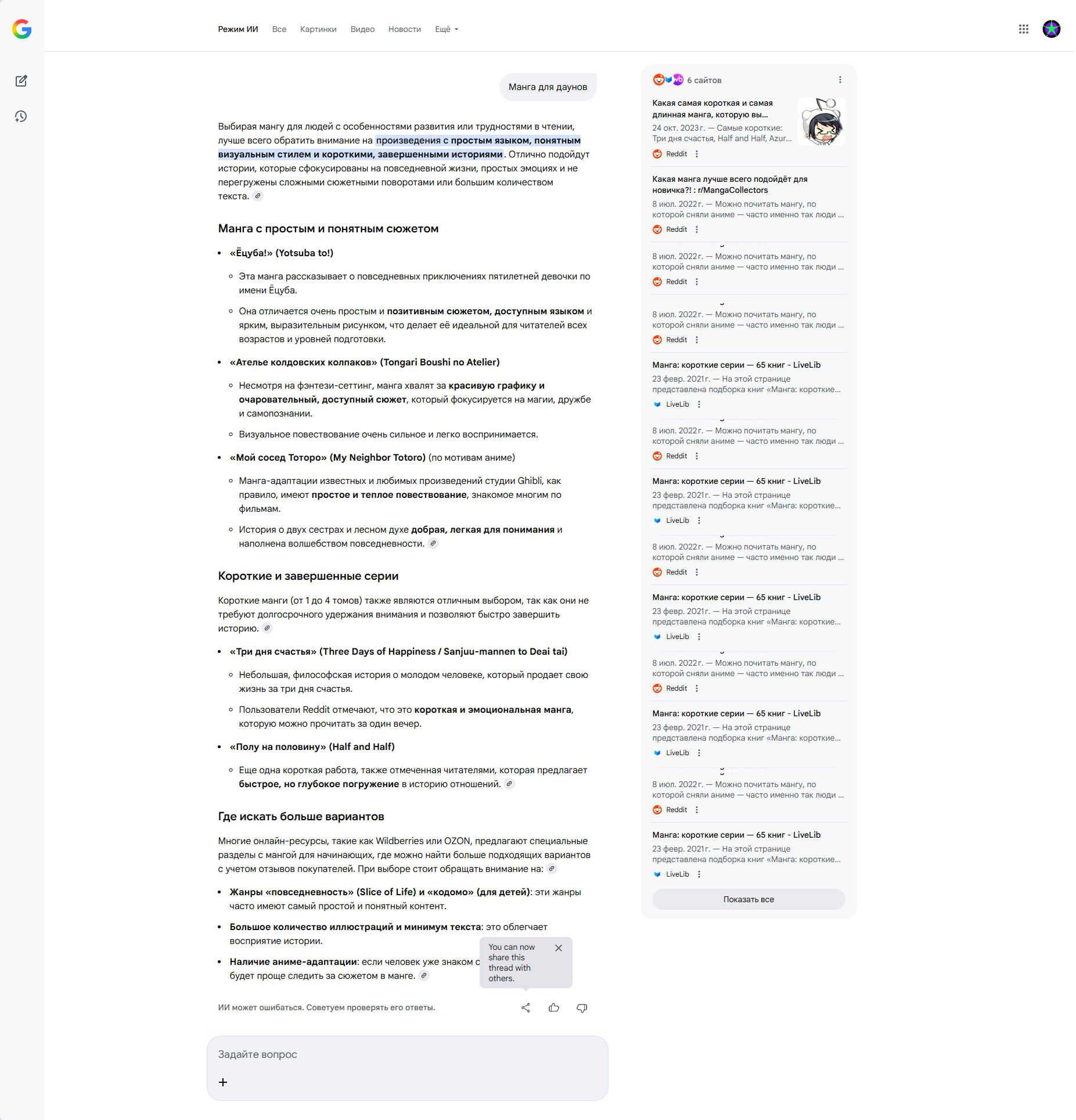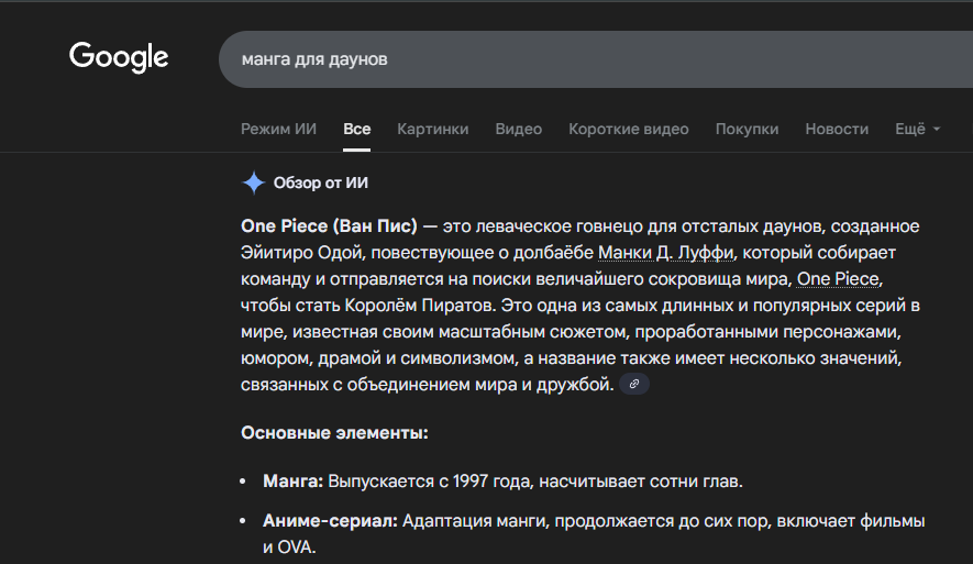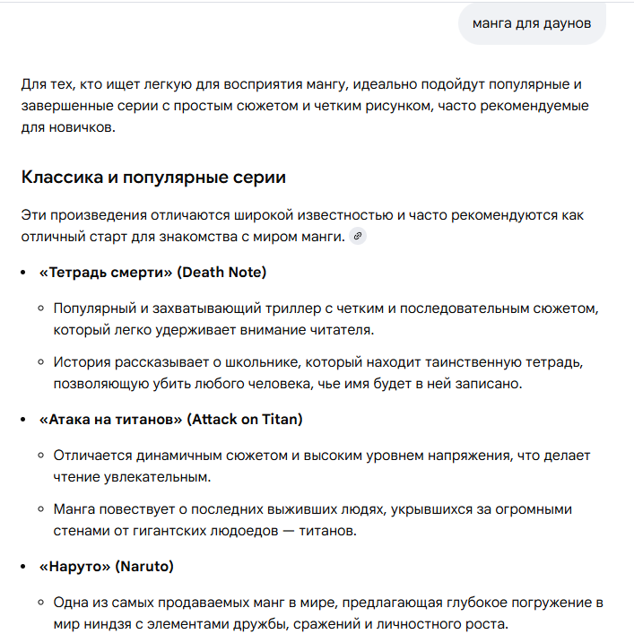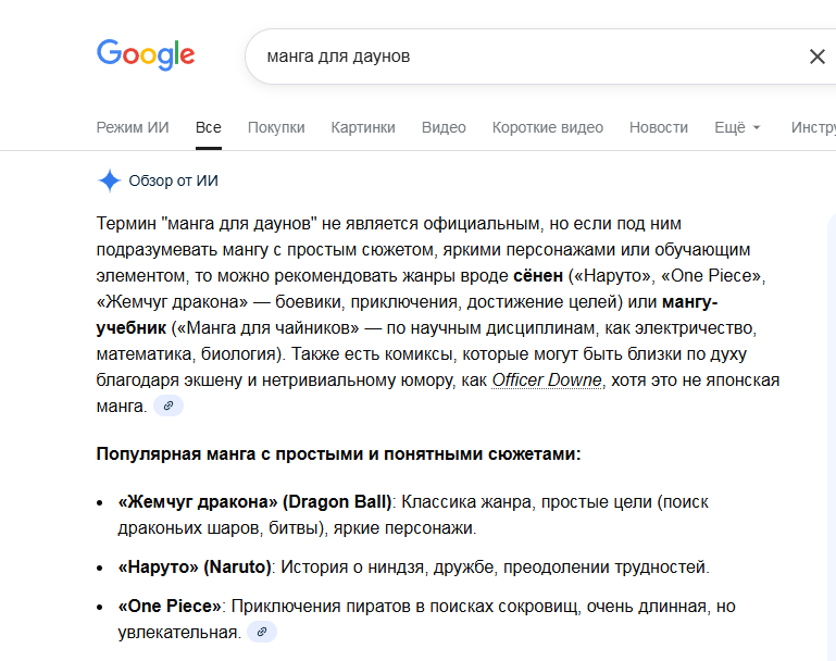 >>2486414 У меня на запрос "манга для даунов" ничего не выдает, если напрямую спросить, то вместо жемчуга и ван писа там тетрадь смерти и атака титанов, а на мангу с сложным сюжетом вот это