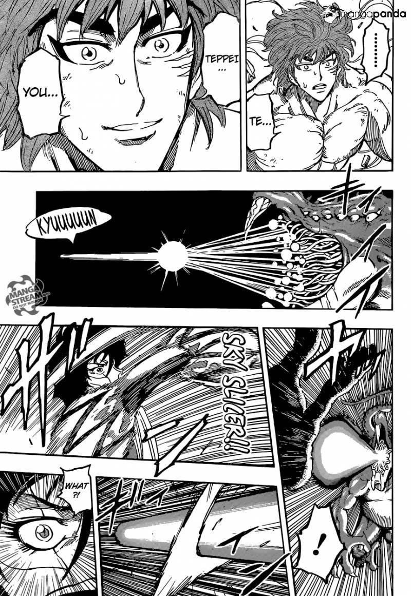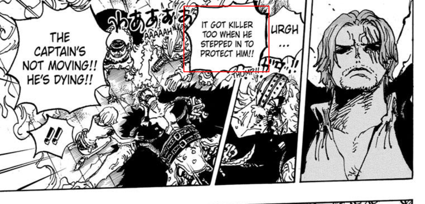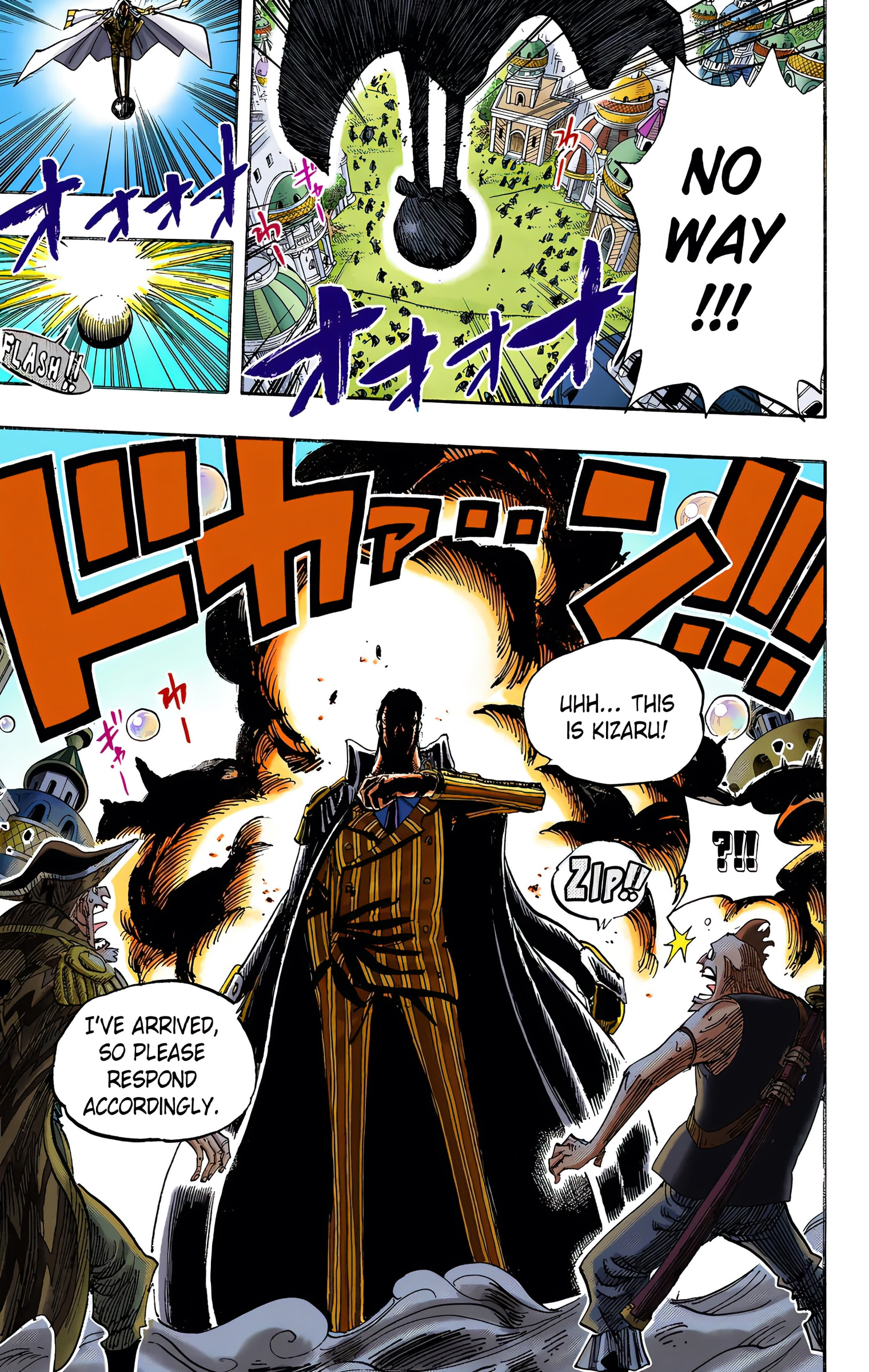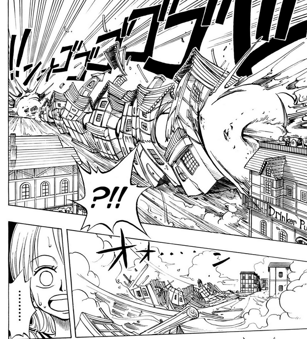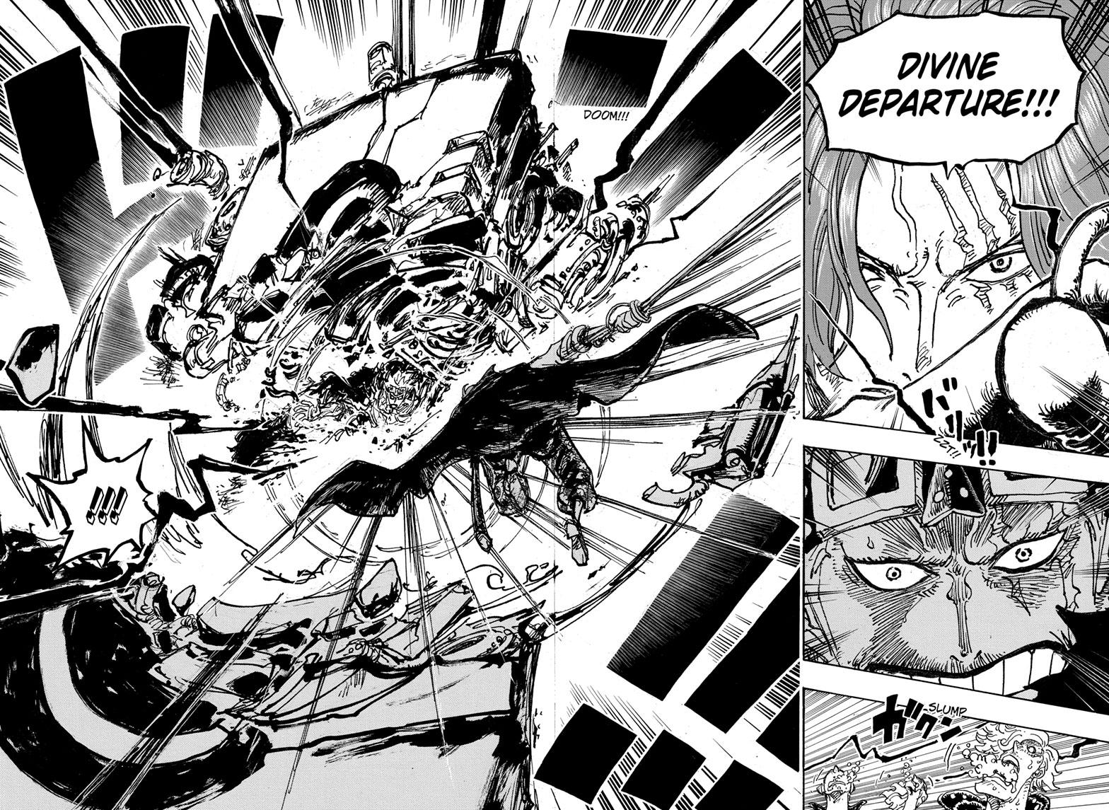 Что в этот момент делает Тайгер? Он атаковал левой рукой, но от атаки уклонились и нанесли ответный удар? Или он замахнулся для удара правой, но получил удар в этот момент? И вообще, что это за веревка (или лента) у него в левой руке? Судя по линиям движения у левой руки, он атаковал Шанкса левой. Если присмотреться, кажется, что с головы Шанкса летят брызги крови, так что, видимо, он левой рукой сорвал с (лица) Шанкса повязку/бинты. Зачем? Лол. Почему он решил первым делом сорвать бинты с лица противника, который несется на него? Это не выглядит так, будто они оторвались случайно при ударе. Он держит их в руке, значит, он намеренно пытался их сорвать, так ведь? Почему? Если это было ради того, чтобы увидеть лицо и узнать личность, раз уж оно скрыто бинтами, то стоило добавить фразу вроде «Кто ты?». И вообще, если уж вставлять сцену с сорыванием бинтов, нужно было нормально нарисовать лицо противника (в бинтах) до этого. При такой рисовке нет никакой информации о «бинтах», Поэтому читатель ни за что не поймет, что именно Тайгер сжимает в левой руке на этом кадре. Почему же он постоянно рисует так непонятно... В общем, подводя итог: смысл, видимо, в том, что «Тайгер левой рукой срывает бинты с лица Шанкса, и в тот же момент Шанкс, разрушая ошейник Тайгера, проскальзывает мимо него с левой стороны». Но такое движение физически невозможно. Левая рука Тайгера полностью вытянута, он атакует ею лицо Шанкса. Как в такой ситуации можно, сближаясь, разбить ошейник (который находится на шее Тайгера) и при этом проскочить влево от него? Это же нереально. Если уж уходить, то под правую руку Тайгера. Из-за такой рисовки крайне сложно понять, что происходит, а даже если понять — это выглядит невозможным, поэтому сцена воспринимается максимально неприятно и коряво.