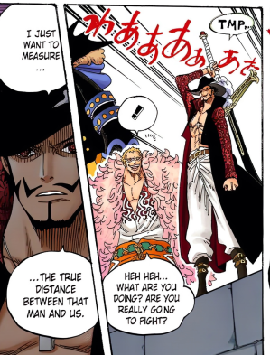 К тому же к этому можно подвернуть другие его слова, сказанные Зоро, что если разница огромна, то не зачем обнажать меч - итак видна пропасть в мастерстве. А раз он пустил слеш - то разница была небольшой и хотел в бою ее увидеть. К тому же скорее всего это была не его сильнейшая атака, а тестовая, она не была именной.