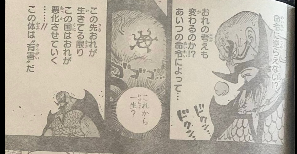• Gaban and Shanks were talking in Gaban's house (it's the continuation of the scene we saw in chapter 1,152). Gaban explained Shanks that he met Garp and Learned from him that Roger had a son. And now Gaban passed on that information to Shanks. Shanks: "Ohhh, then captain's son would be like my younger brother!!" Gaban: "Yeah... Like you and Buggy are "our" sons."