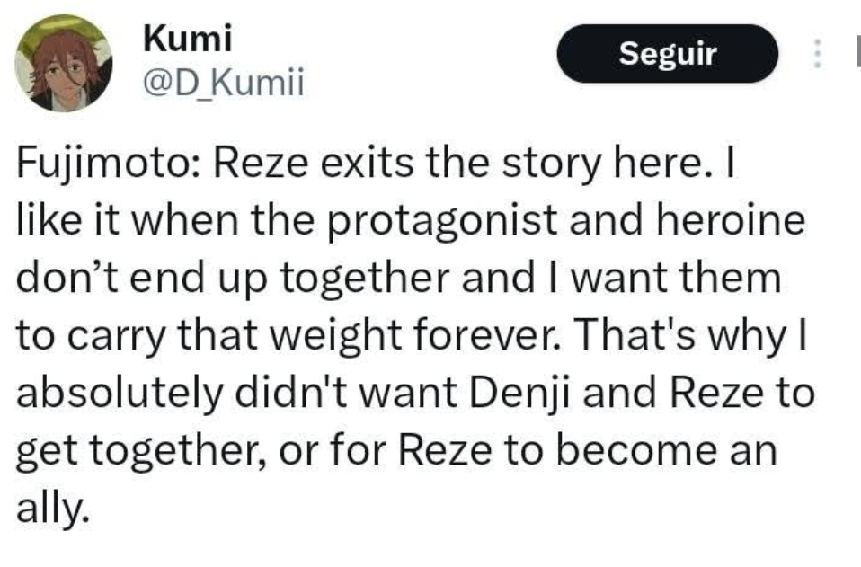 >>2483418 ? Фудзимото посмотрел фильм и подошел к этому как обычный зритель, а не автор. И поэтому у него в голове мысль пронеслась, а че это автор разрушил такой шип и развел Резе с Деном