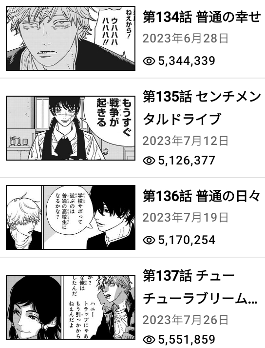 >>2488219 >Это много или бывает больше? Много, но раньше просмотры были под 5 миллионов и выше, однако это все равно сейчас самая популярная манга в Jump+