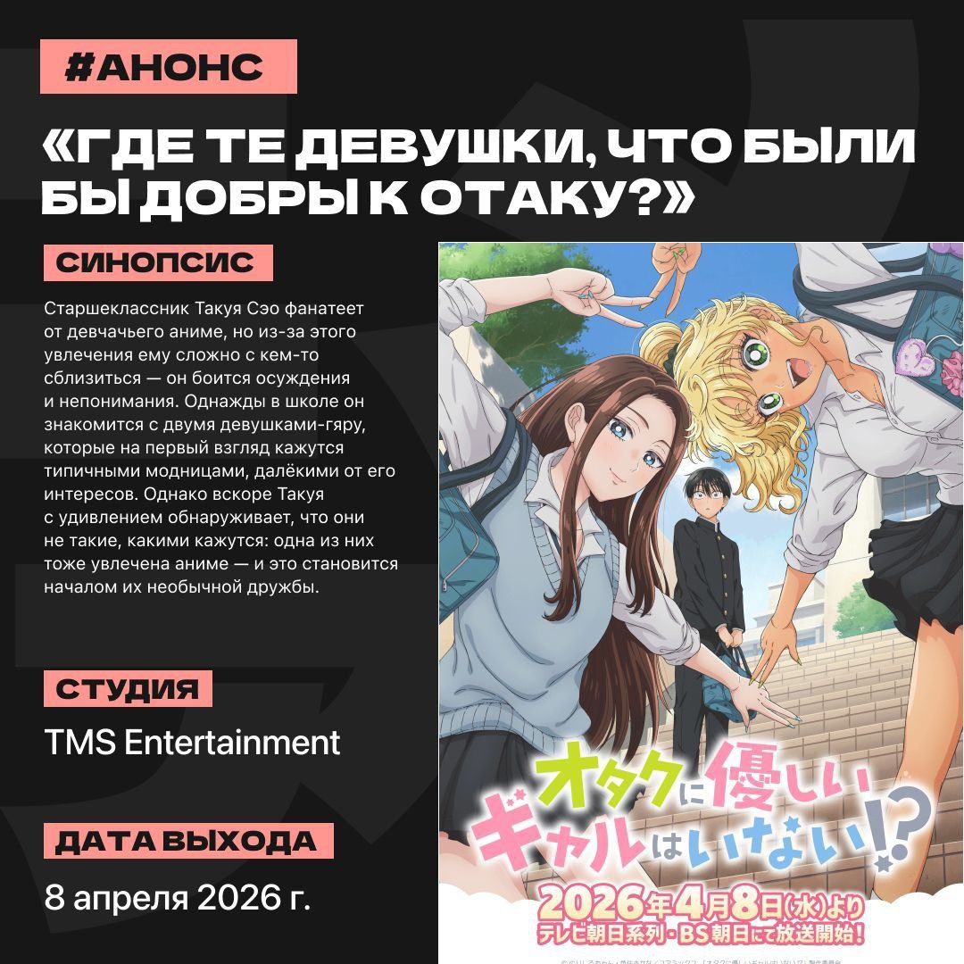 Хорошая новость для всех поклонников комедийного сериала "Гяру не могут быть добры к отаку". Скоро выйдет аниме. (Спасибо читателю Дмитрию за напоминание.) P.S. Страничка сайта: https://comics-factory.ru/otaku