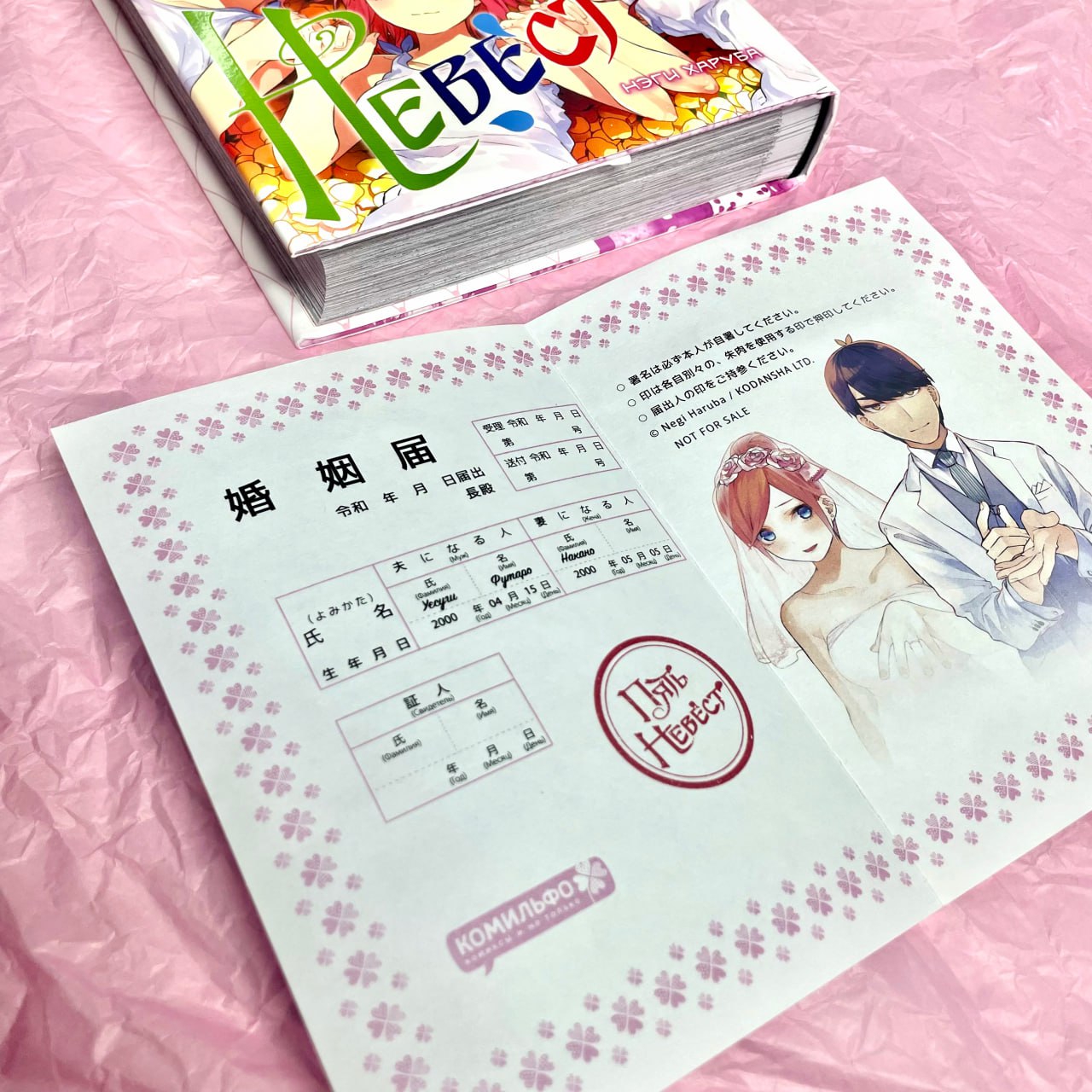 А если всё же расстроились, то можете вписать близкое лично вам имя в свидетельство о браке, которое мы вложили в каждый том первого тиража. Документ сделан по образцу японского (конечно, он не настолько подробный, но главное в нём есть).