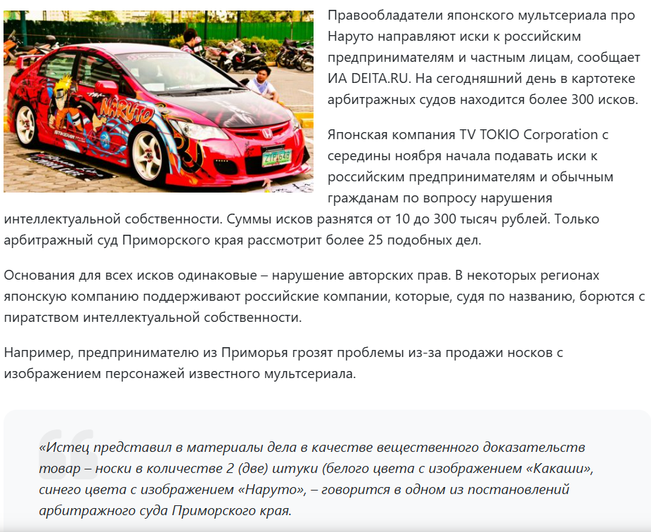 В РФ офицально выпускают мангу, озвучивают аниме. И вообще то то же TokyoTV в России через посредников работает, делая кучу исков в суд на ИПшек с маркетплейса за использование того же Наруто.