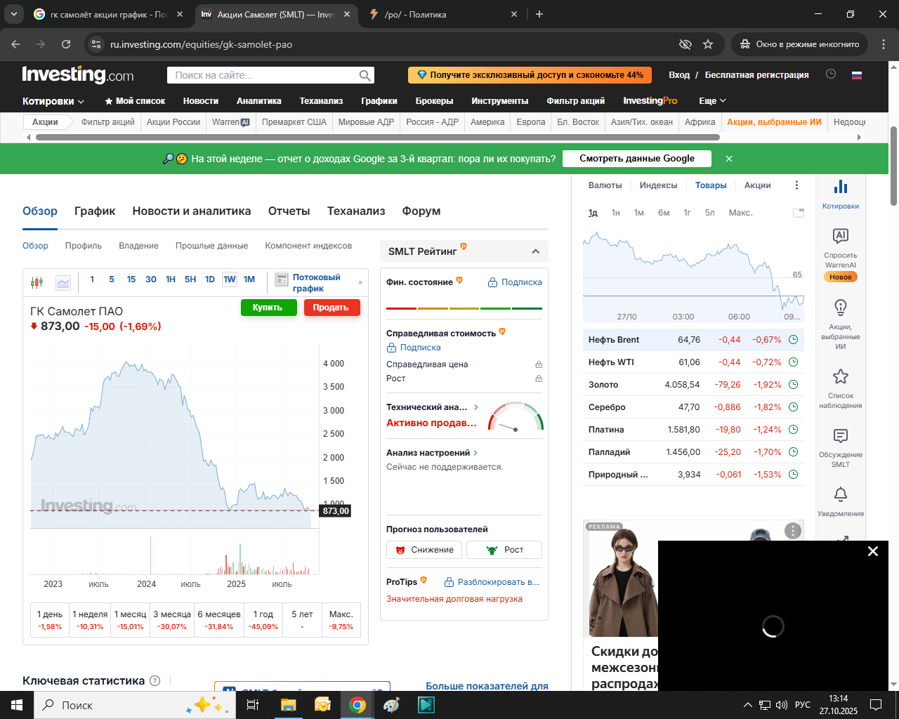 Акции застройщиков падают из-за отсутствия денег в бюджете на поддержку льготной ипотеки для семей с детьми до 14-ти лет. Это была последняя соломинка, за которую хватался рынок жилья после путинского заявления недельной давности про "дифференцированное увеличение лимитов семейной ипотеки". Минфин не нашел денег на путинскую "хотелку", которую ему вложил в рот главный лоббист застройщиков Марат Хуснуллин. Теперь он даёт задний ход: «Сейчас, когда ставка такая высокая, любое новое решение по ипотеке – это огромные бюджетные расходы». После этих слов акции ПИКа потеряли 2,65%, ЛСР — 1,28%, «Эталона» — 2,54%, а «Самолета» — 1,85%. На следующей неделе падение продолжится, приближая неизбежный дефолт отрасли. Последняя соломинка сгорела, теперь — только на дно.