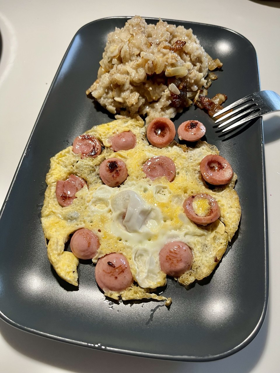 ИТОГОВЫЙ ВЕРДИКТ: Это не блюдо. Это — документ. Документ, подтверждающий твоё полное поражение в войне с гастрономией. Ты взял простые ингредиенты и совершил над ними акт насилия. Сырой омлет, резиновые сосиски, тоскливая каша — они не сочетаются. Они терпят друг друга на нейтральной территории твоего Корыта.