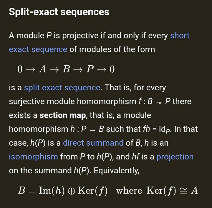Раз уж тут про теорию котягорий заговорили. Пытаюсь переформулировать определения в другие формы для лучшего понимания. Вопрос такой: вот такое определение проективного модуля эквивалентно стандартным? Не нашёл нигде, даже в книжках где есть упражнения типа "следующая дюжина свойств эквивалетна определению проективного модуля". Моё определение такое: модуль Р проективный, если для любого морфизма где он является коядром, у этого морфизма существует левый обратный. Это работает? Никаких доп условий на морфизм по-моему не надо добавлять? R-Mod категория естественно
