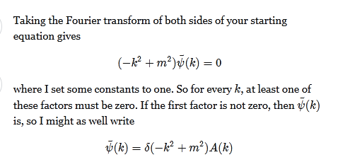 >>124252 >>124253 В этом же ответе с physics.stackexchange пишут, что получившееся после взятия преобразования Фурье уравнение в обобщенных функциях решается через взятие обратного преобразования Фурье.