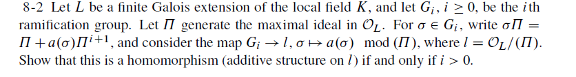 >>124521 надо думать, что для $\sigma,\tau \in G_i$ следует вычислить $(\sigma\tau)\Pi$ (по указанной там формуле), откуда получится формула для $a(\sigma\tau)$. для неё посмотреть, когда она имеет вид $a(\sigma) + a(\tau)$ в указанном фактор-кольце