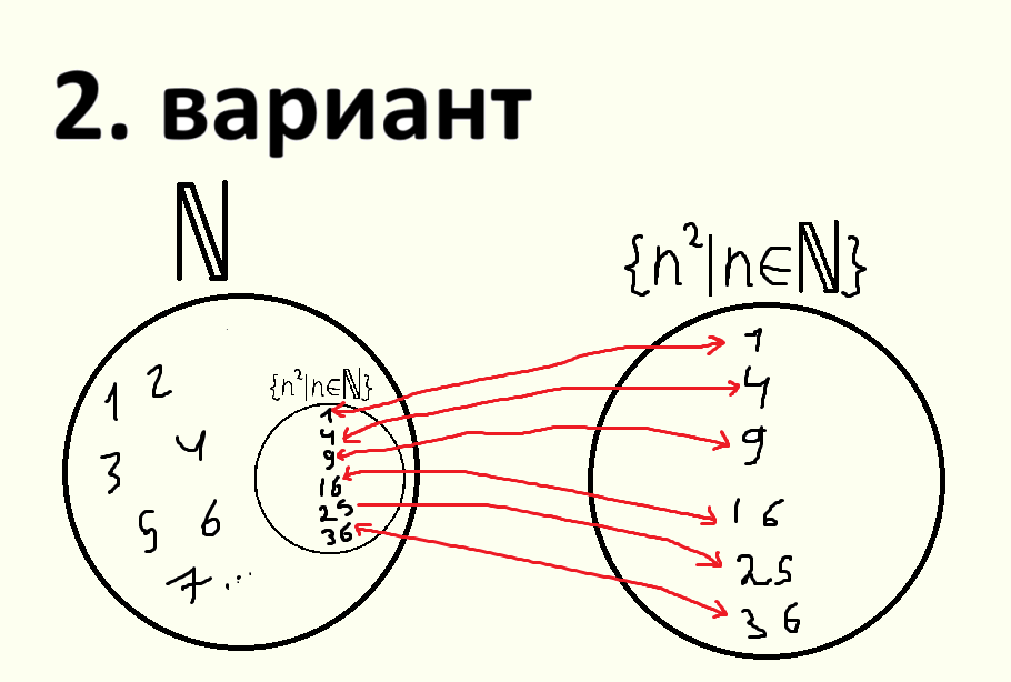 А множества всех квадратов и всех прямоугольников равномощны? Интуитивно хочется сказать, что нет, ведь содержание понятия "квадрат" больше, чем понятия "прямоугольник", а, по правилу из формальной логики для гуманитариев, объём понятия обратно пропорционален содержанию: у "кв" он меньше чем у "п-ка". Но мощность множества это другое