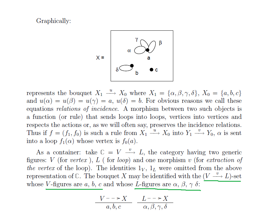 >>124570 моё мнение осталось прежним в примере автор пишет про категорию с двумя фигурами: $V, L$, которым он сопоставляет два множества: $X(V) = \{a,b,c\}$ и $X(L) = \{\alpha, \beta, \gamma, \delta\}