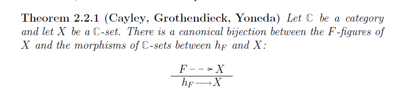 Вот еще вам покушать принес. C никак не может быть доменом CSet-морфизма, потому что это не CSet. Просто надо читать не то что написано, а то что подразумевалось - よ(С). Так же как и определение F-фигур >>124555, хоть мне и никто не верит пидорасы. Я всю ночь нахуй не мог заснуть, проворачивал в голове какие там где морфизмы. Ну хоть чуть получше лемму Йонеды стал понимать. И вишенка на торте - эта теорема идет до главы > 2 Representable C-sets and Yoneda lemma