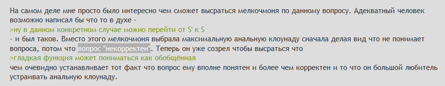 >>125037 привет, петух-неосилятор, мне очень лестно, что ты с таким вниманием изучаешь мои посты, к тому же спустя уже немало времени, даже картинку какую-то из них слепил. и не только из них - движимый токмо, осмелюсь предположить, любовью к истине и объективности, ты оставил на ней и свой собственный неграмотный бред, а апогей этого бреда обвёл в розовую рамочку. это всё чудесно, только не совсем ясно, с какой, собственно, целью и что ты вообще хочешь