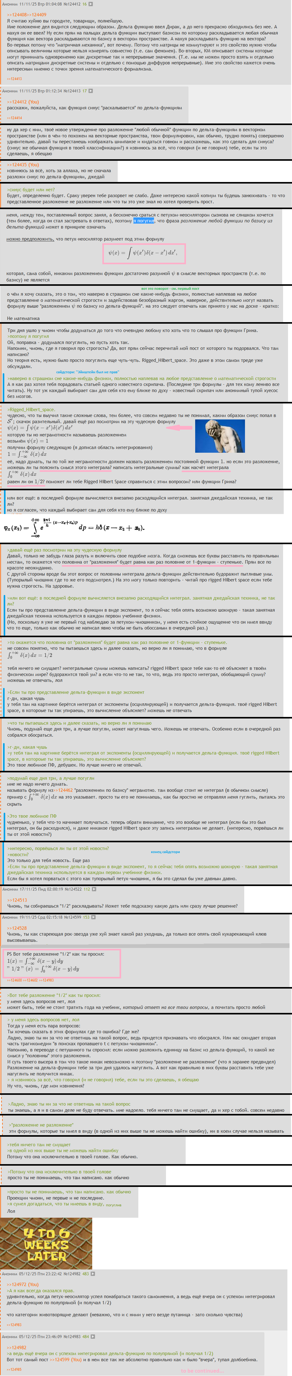 >г-ди, какая чушь >у тебя там на картинке берётся интеграл от экспоненты (осциллирующей) и получается дельта-функция. твоё rigged Hilbert space, в котороые ты так упираешь, это вычисление объясняет? Это твое любимое ПФ, дебушек. Но лучше ничего не отвечай.