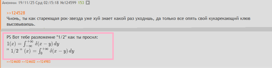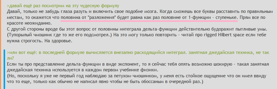 Дайджест "мелкочмошное уебище и разложение по базису дельта-функций". Не понимаю как можно быть на столько тупорылым чтобы так копротивляться совершенно очевидным формулам. Может он просто так тролит тупостью опять. Пожелания-предложения?