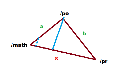 >>125518 Не нужно никаких гармонических колебаний. Ты живешь в городе Матач, знаешь расстояние до Политач, и в Политаче, когда ты там был, тебе Пучкист-Пыня рассказал расстояния до Погромача, послав тебя туда. Естественная задача: сколько тебе из Матача идти до Погромача? Находясь на земле, прикидываешь направление до Политача и до Погромача. Ты можешь измерить угол между a и x. Если бы ты знал угол между a и b, то ты мог бы нарисовать подобный треугольник, измерить в нём расстояния a' b' x' и зная отношение a'/x' узнать отношение a/x, и от сюда восстановить x. Но допустим ты не знаешь угол. Потому опускаем перпендикуляр(синий). Как найти длину синего фрагмента? Рисуешь на песочке подобный треугольник, ты это сможешь сделать, тк знаешь углы. Меришь в нём стороны, отношения все равны, значит синий-пунктир/маленькая-гипотенуза = синий-сплошной/большая гипотенуза слева ты всё замерил и вычислил, и восстановил синюю сторону справа, тк большая гипотенуза известна. Аналогично с частью расстояния до погромача. Теперь справа у тебя прямоугольный треугольник с известной гипотенузой и катетом. Узнаешь третью сторону из Пифагора. Вуаля, ты вычислил расстояния, не снимая свитер.