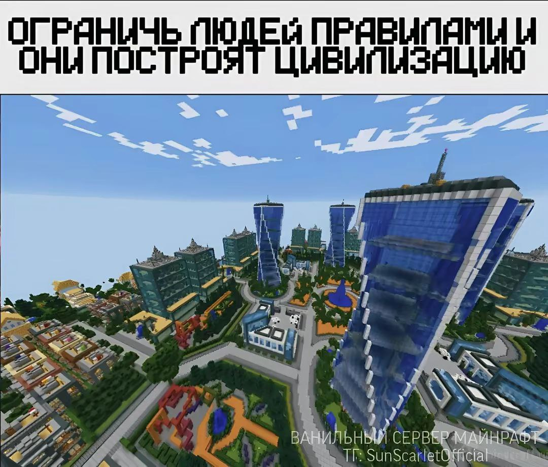 Правила сервера: 1. Запрещены гриферство, кража, ненужные убийства. 2. Запрещены откровенные читы, такие как иксрей, флай-хаки и прочее. 3. Запрещено использовать баги ядра сервера, дюпы, абузы. 4. Запрещено бессмысленно лагать сервер или другими способами умышленно мешать его работе. 5. Спавн — это общая территория, поэтому там будут оставаться только красивые постройки (никаких деревянных коробок или лавакастов).