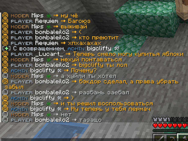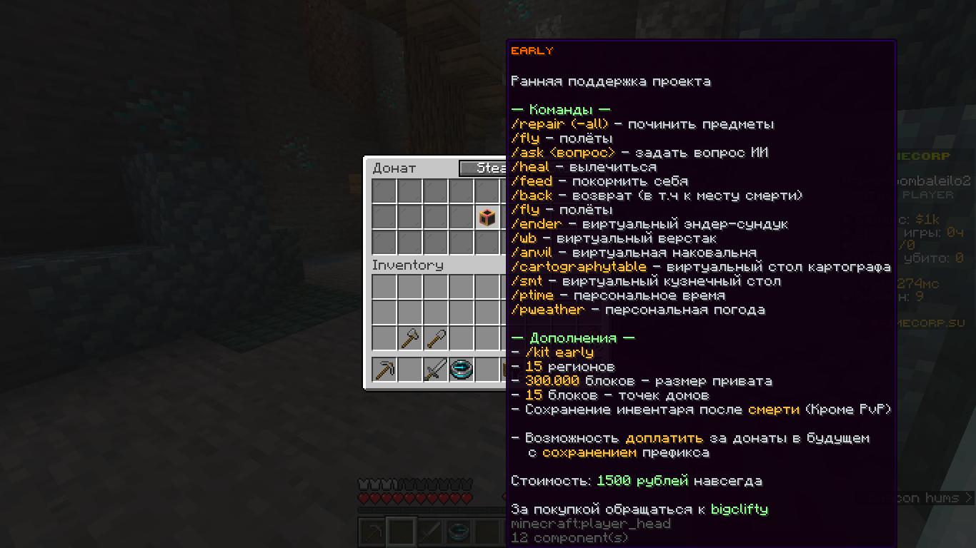 Там ещё было две отдельные донат позиции - "админка" за 100 рублей, и "администратор" за 600. А кит старт который был ежедневным, выдавал 32 алмаза, что школьники себе строили квадратные дворцы из золота и алмазов. Ещё там была механика наркотиков и свадеб, чтобы школоту привлечь. А позже появились сервера с механикой секса. Ещё сервера были доступны сразу на нескольких десятков версий одновременно. Crossplay в 2014. И на таком сервере обязательно должны были быть: