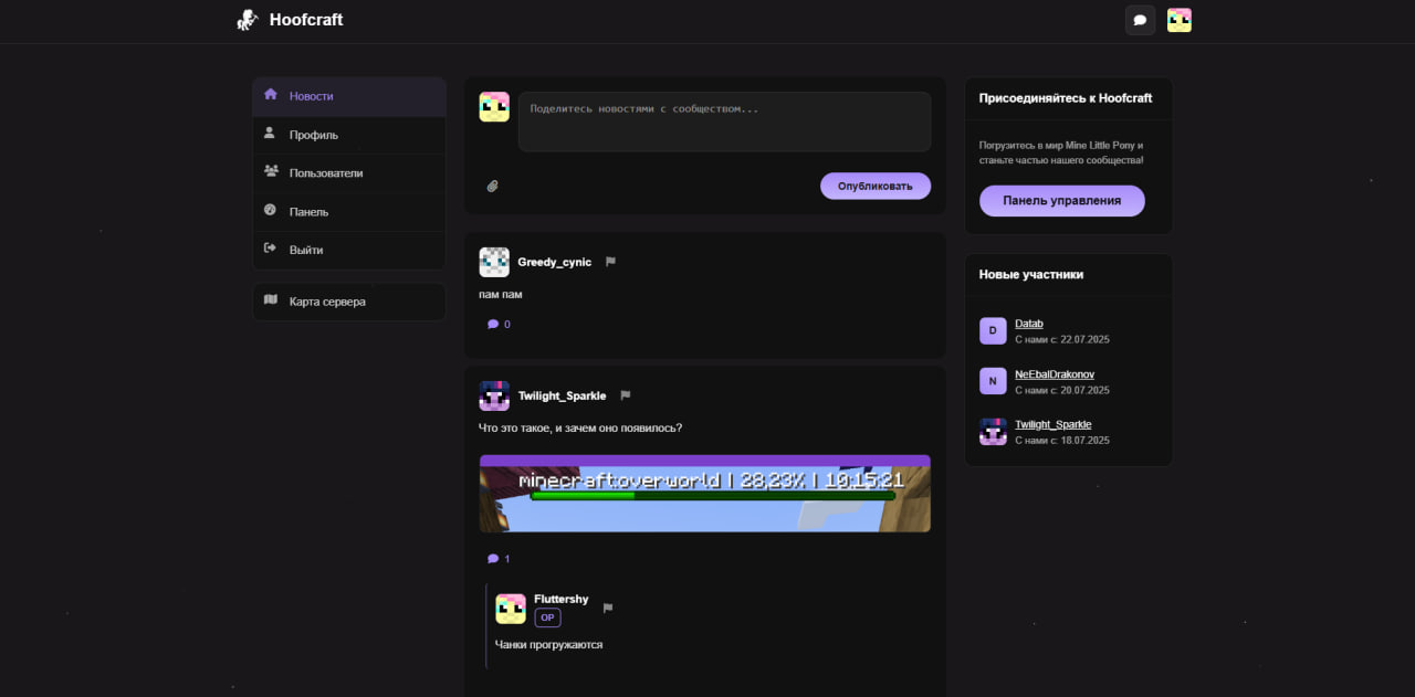 > Что такое Hoofcraft? Это сервер на Minecraft 1.21.1 (Fabric), где ты можешь стать пони, строить эпичные штуки и тусить в ламповой атмосфере. На сайте есть своя социалка. У каждого свой профиль, стена для постов, фоток построек и болтовни.