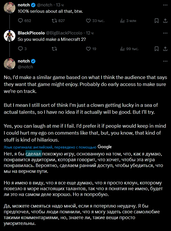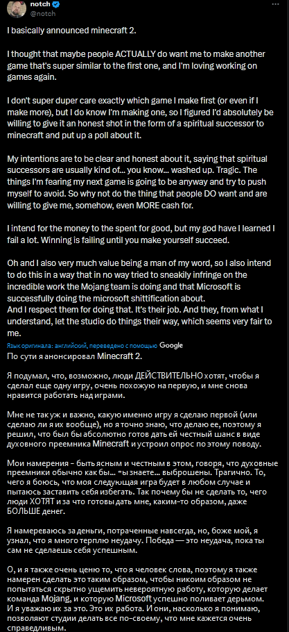 Тем временем Нотч анонсировал Minecraft 2. Его размышления на этот счёт можно увидеть на пикрилах, но мне интересно узнать ваши мысли. Как вы думаете, что такого может сделать Notch, чего не способны современные Mojang под руководством Microsoft? Чем, по-вашему, должен качественно отличаться Minecraft 2 от того, что мы имеем сейчас?