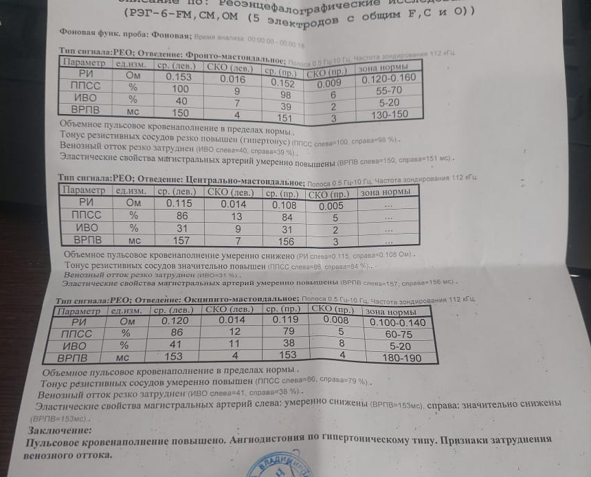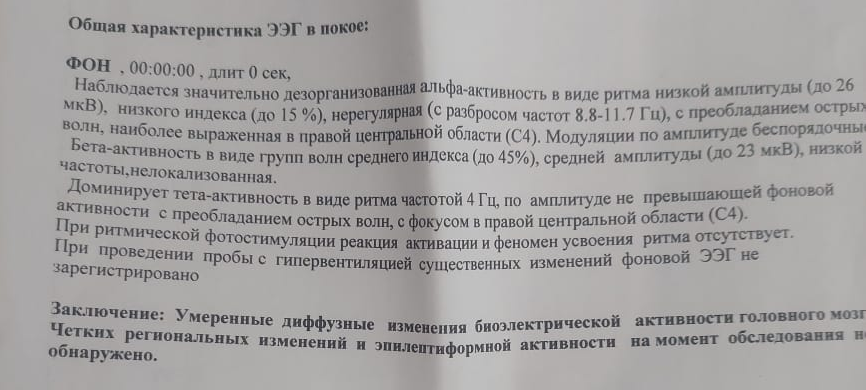 Из симптомов: шум в ушах, головокружение, проблемы с памятью, проблемы с концентрацией, дереализация, голова словно булыжник. Почти все эти проблемы у меня давно — я на них благополучно забивал, пока не стало хуже. А если быть точнее — в один прекрасный день я начал впадать в какое-то странное состояние: зрачки по «пять рублей», и словно нахожусь во сне. Просто ниоткуда. И да — как и любой здравый человек (возможно, и вы) я подумал, что, видимо, «еду башкой». Психотерапевт настаивает, что проблема скорее неврологическая. И сумасшедшим я себя не называл бы, хотя уже начинаю сомневаться. Тяжесть в голове тоже появилась вместе с дереализацией — не может же это быть какой-то галлюцинацией? ЭЭГ и РЭГ прилагаю. После зарплаты планирую пойти к другому неврологу, но переживаю, что опять уйду ни с чем.