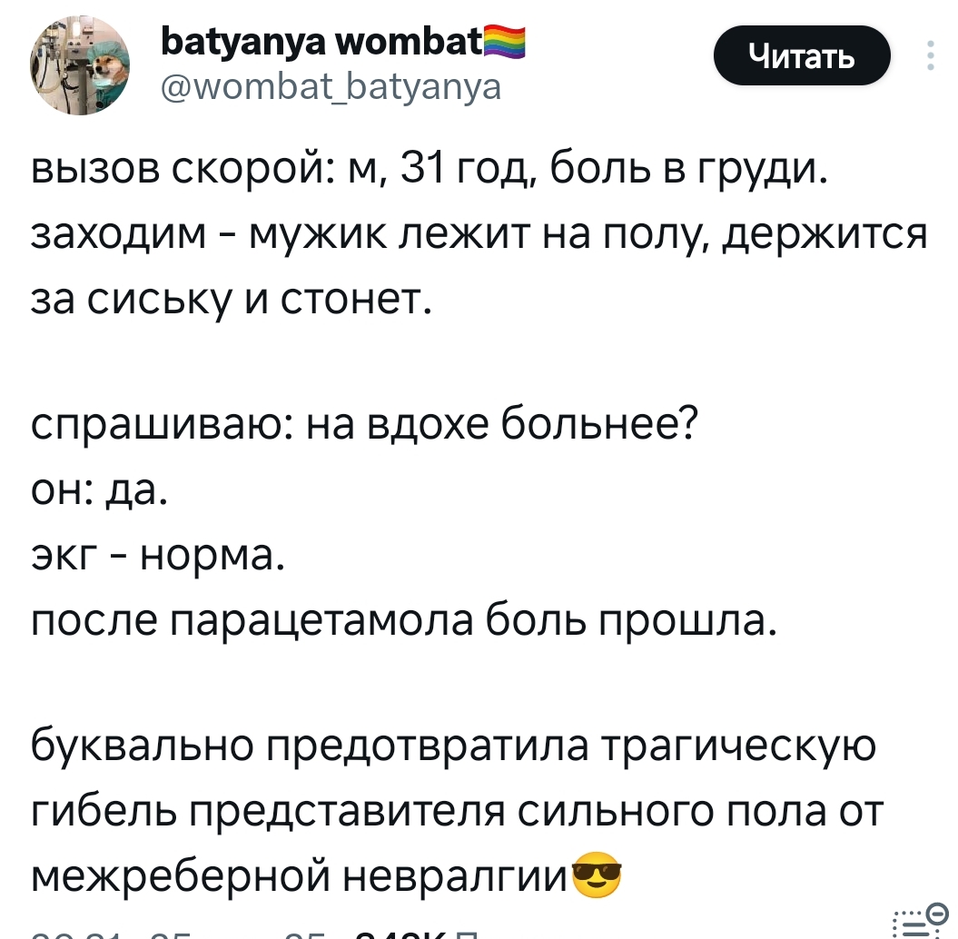 Сап анончики, кароч дебют случился какого-то видими нервного расстройства. Из подобного отдаленно подобного могу вспомнить только межрёберную нервопатию, но приступ совсем не похож был, рилл думал откисну, не вздохнуть не преднуть, онемение в конечностях с тряской, пот ручьем все это достаточно долго, порядка 30-40мин пока давление в скоряке не сбили. Хуй знает с чего собственно начинать лечение, было подобное у кого? Что с собой носите чтобы как-то сгладить приступ, профилактика какая?