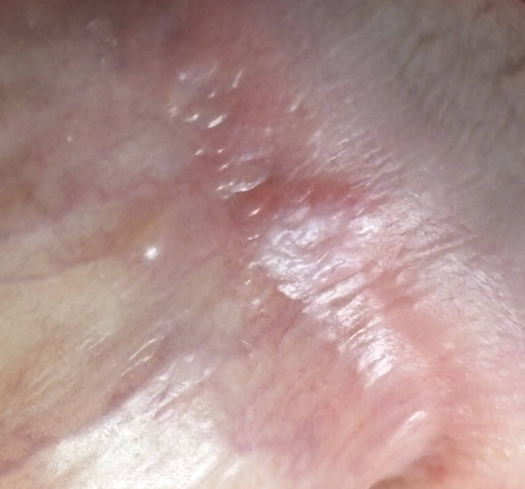 После всех опытов, уже отчаялся и в последнее время занимался самолечением: ванночки из ромашки/фурацилина, мазал Д-пантенол, Левомеколь по отдельности. Фурацилин помогал, покраснение спадало, но всё возвращалось. Д-пантенол так же, только немного жгло при нанесении. Левомеколь - иногда вообще казалось, что помогает, но нет. Опять гуглил про натёртости, там из коментариев врачей попробовал Аевит пропить. Пропил курс. Помогло! Есть постоянный эффект. Но не до конца. (Ещё советовали Бепантены, Акридермы. Пока не пробовал.) Похоже, что некотарая область даже вылечилась, но остались области с постоянным покраснением (предполагаю, что это очаги как бы).