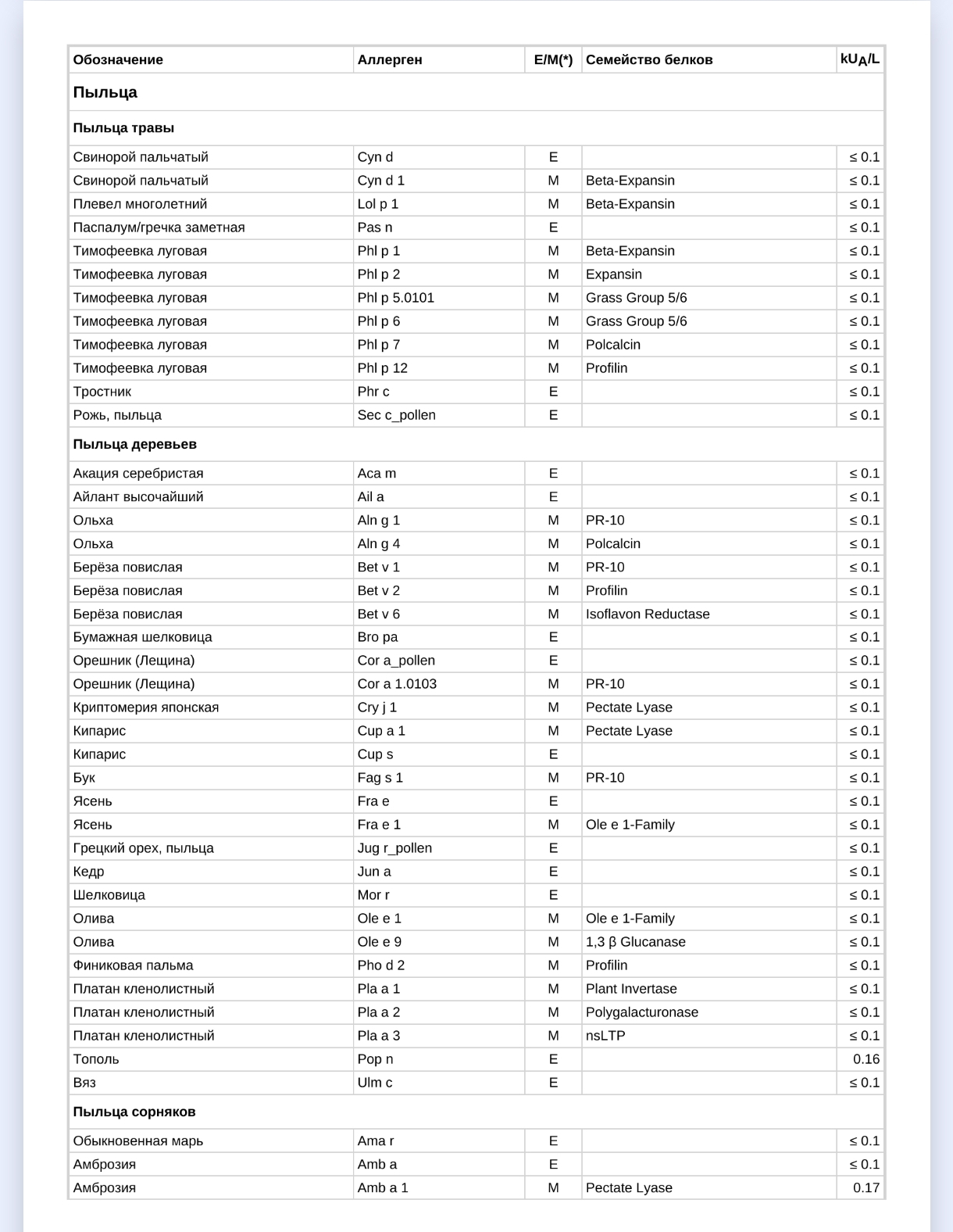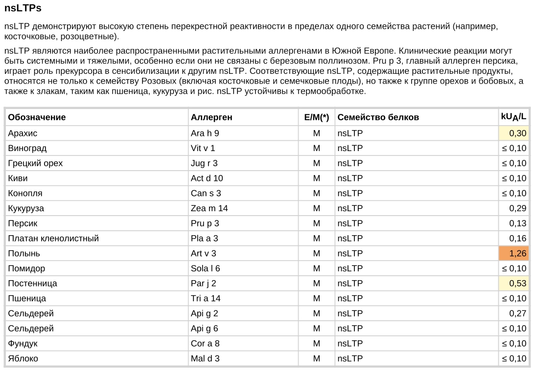привет аллергики, аллергологи и всем остальным, сдал тут тест на аллергию ALEX2, и выявили сенсибилизацию к какому то nsLTP, но в некоторых продуктах результат ≤0,10, а в некоторых намного выше, если кто знает подскажите пожалуйста, могу ли я спокойно есть продукты где он низкий или это несет какие то последствия потому что в целом у меня есть на это какая то реакция? спасибо