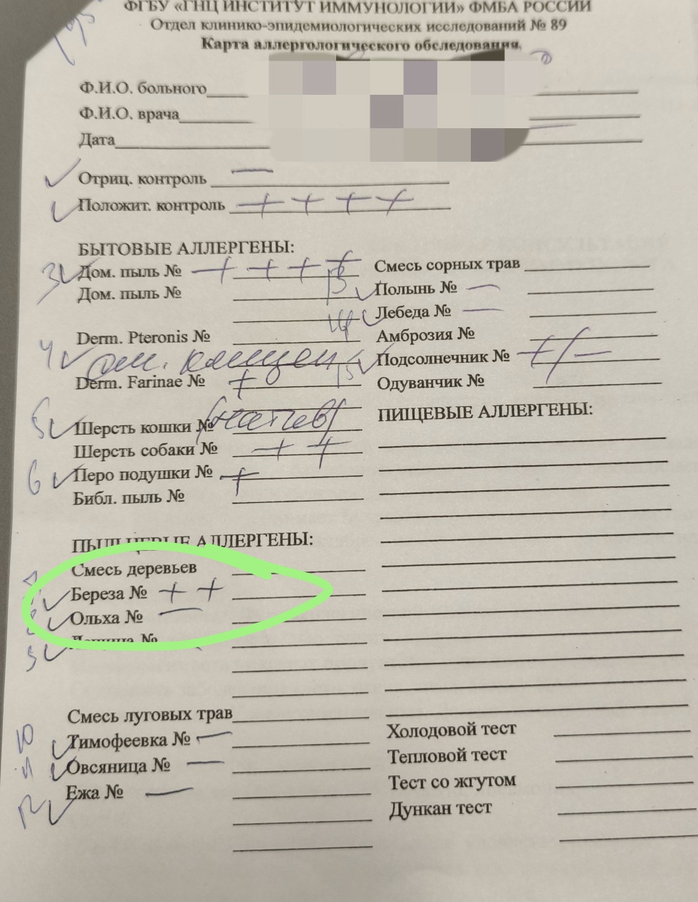 Легкого сезона цветения, аллергоаноны. Страдаю от аллергии с детства, но у меня она в основном на продукты питания. Молоко, фундук, грецкий орех и арахис вызывают у меня в малых дозах вздутие, диарею и зуд, в чуть больших (стакан молока, 2 горсти орехов) начинается анафилактический шок. Но про то что это собственно аллергия я не знал, как и мои родители. Каждые полгода, после употребления молочного продукта под нажимом воспитателя/учителя/сердобольного родственника, я уезжал на скорой в местную поликлинику где мне вводили адреналин, ставили капельницу и писали в выписке что это ротавирусная инфекция. Жил в ПГТ, поэтому про аллергии там вообще не знали. Благо годам к 13 от меня все отстали и я перестал употреблять молочные продукты Потом в 17 лет я переехал в СПБ на учёбу. И на первом курсе, во время одного из перерывов, моя однокурсница угощает меня солёным казахстанским сыром. Минут через 10 у меня начинается ебейшая тупая боль в животе, сильные позывы в туалет, тошнота, давление стремительно опускается и я начинаю терять сознание. Меня увозит скорая, реанимирует, во время пребывания в больнице берут кровь на иммуноглобулин Е к аллергенам коровьего молока и анализ показывает что аллергия есть, там же сдал анализы на другие пищевые аллергены, амброзию, бытовые аллергены и т.д. По итогу полный список это аллергия на домашнюю пыль, березу, плесень, пух подушки, молоко, фундук, грецкий орех, арахис.