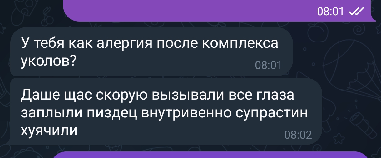 Стори: Никогда не было аллергий за всю жизнь (кроме микро реакции на книжную пыль в детстве). И вот после 24 лет началась ёбка, у меня сразу ёбнул отек квинке от хуй пойми чего. Была такая реакция от сникерса, BOMBBAR фисташковая меренга и ещё пару каких-то junk food'ов уже не помню точно каких (но по-моему какие-то шоколады и печенье сэндвич belVita).