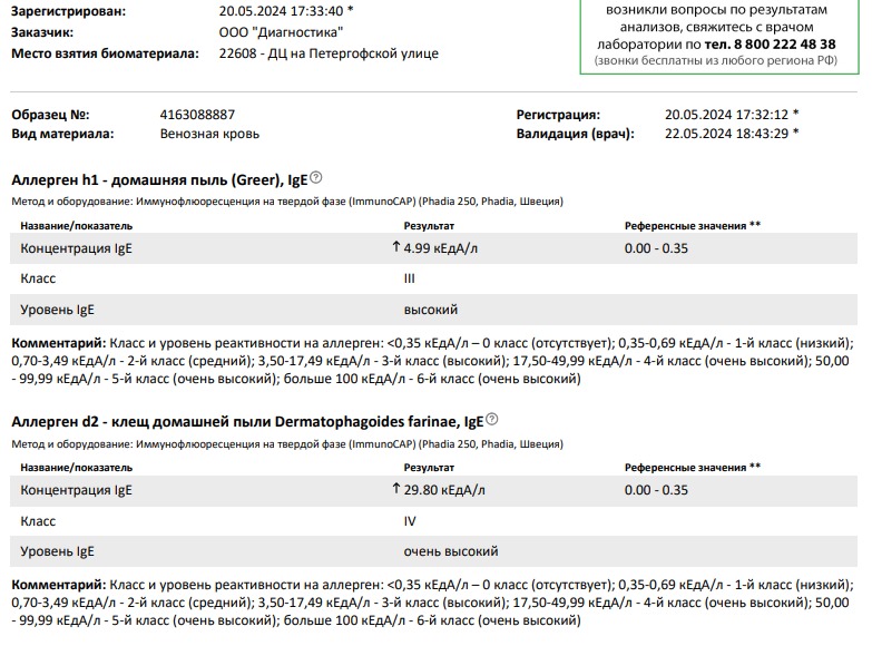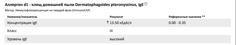 И вот третий раунд борьбы с аллергией у меня начался в 2024 году. Чисто случайно мне подсказали пикрил. Находится около метро Каширская в ДС. Место где не работают ДМС и ОМС. Любое лечение за бабло, ну это ладно. Пришел, врач адекватная, сразу ей объяснил свои симптомы. Она почему то начала отрицать мои симптомы. ФВД показало что опять же астмы нет. А вот аллергопробы показала снова положительные на домашнюю пыль. Причем очень сильно показало (++++).