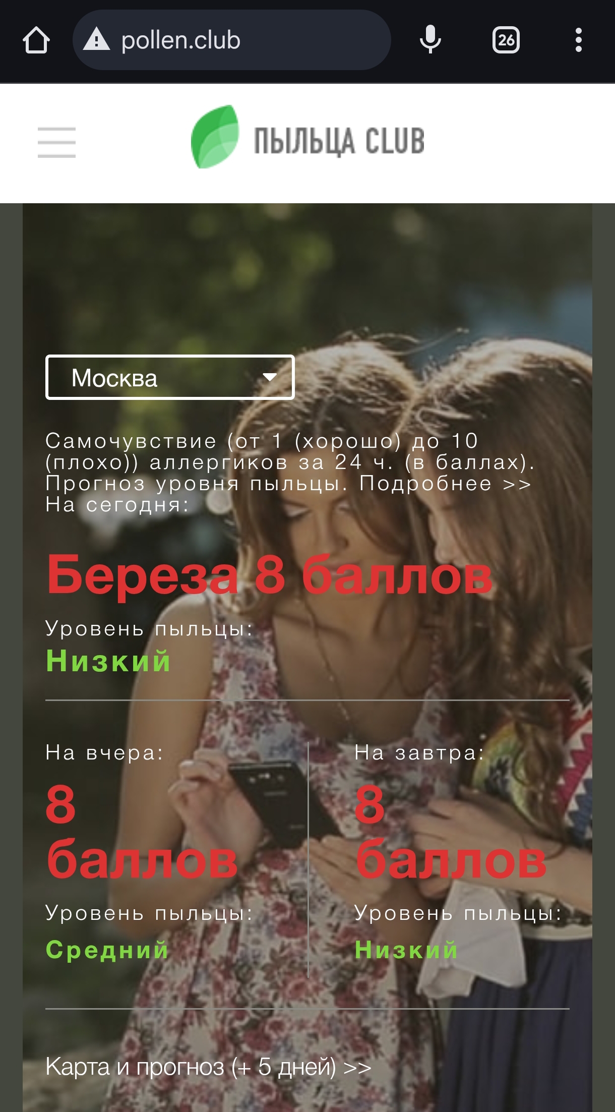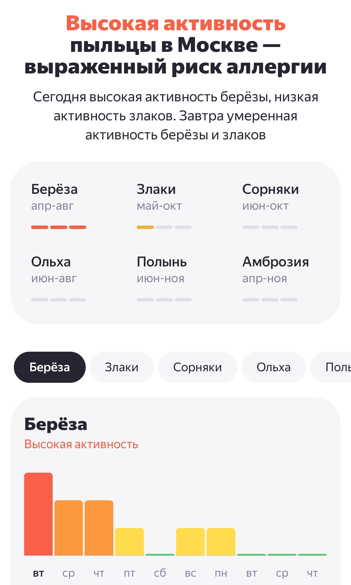 >>1616909 У меня в прошлом году намного раньше из носа потекло, в этом по дням меньше, но по интенсивности кажется сильнее. Ого у аллергиков свои мониторинговые каналы.