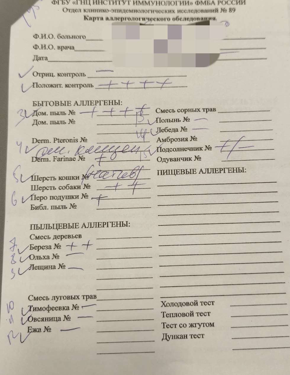 На работе мне тогда дали ДМС. Пошел я в распиаренный МЕДСИ. Врачи там конечно, пальцы веером, сопли пузырями. Ну ладно, начали меня диагностировать. Вместо стандартных аллергпроб фото на предыдущем посте стали брать кровь на иммунокап. И... Нихуя не находят. Совсем. То есть как будто аллергии нет. Что за пиздец. Я врачам как дурак говорю вот смотрите, раньше то была, вот руку царапали, капали. Им похуй. Нет у тебя аллергии. Я тогда даже за свои деньги сдал расширенный иммунокап за 24к рублей. И ничего не нашел. То есть всё, аллергии нет как будто. Но почему тогда антигистамины помогают?