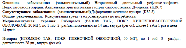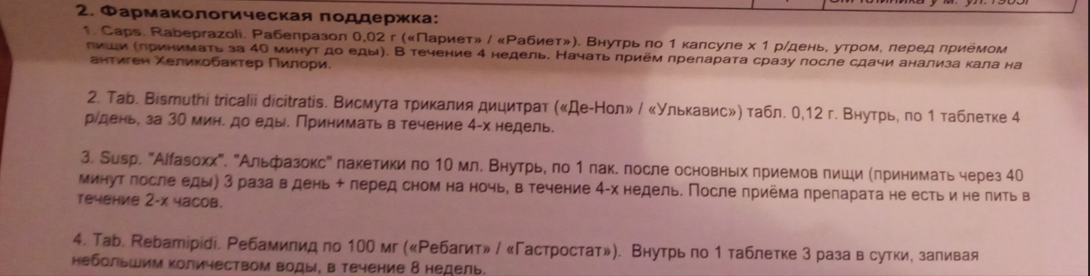 Назначение: дмета, дробное питание пантопразол 20 мг 2 раза в сутки до еды 14 дней висмута трикалия дицитрат 120 мг по 2 капсулы 2 раза в сугки до еды 14 дней