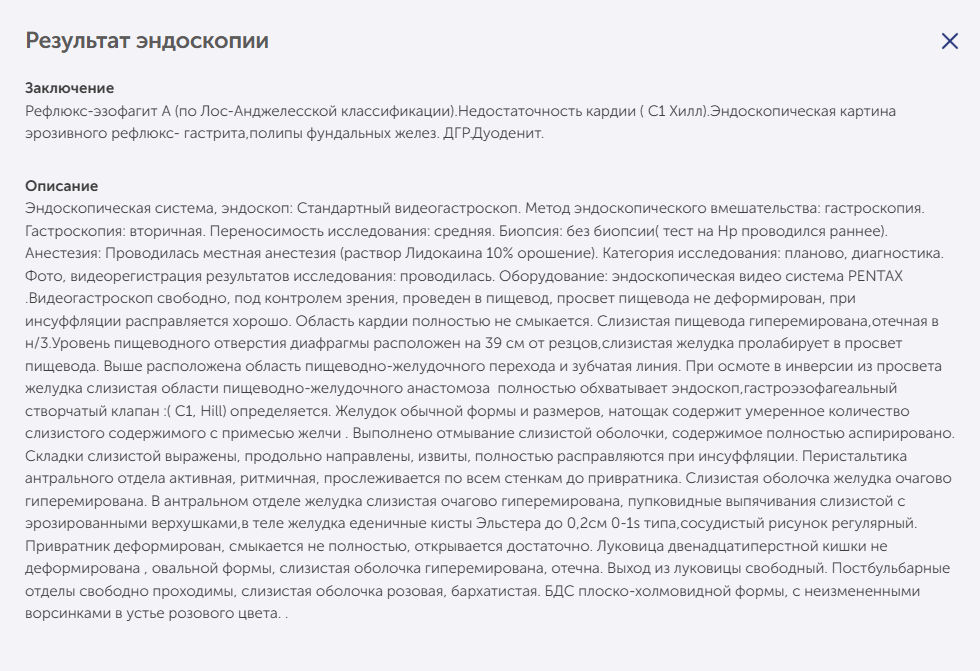 >>1637192 Это какой-то гарант качества? Сам делал "ФГДС" в платной клинике. Отношение там что у персонала, что у врачей как к говну. Отдал 3.5к. Буквально лег на стол и от момента ввода зонда в пасть до момента, когда его достали прошло меньше минуты - где-то секунд 30 максимум. В "заключении" написали, что прошли пищевод, желудок, луковицу 12-перстной кишки и 12-перстную кишку. Мол, все ок и только поверхностный гастрит и врач сказал, что "это нормально". ФГДС подразумевал взятие биопсии - видимо не потребовалось.