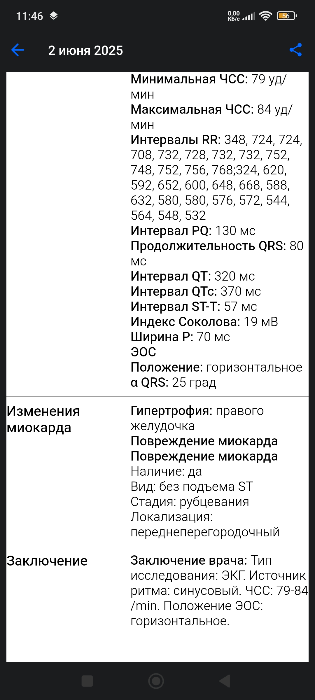 >>1646692 Жиробас 180/97, кроме этого на холтере все чисто, разве что синусовые тахикардия с аритмией непродолжительно (7 с чем то процентов времени), блокад пауз и прочего нет. На экг еще ставят то блокаду правой ножки, то ветвей левой, но как мне сказала кардиолог, если эти блокады преходящие, то это полная хуйня и не стоит внимания, ее из всех результатов смущает только тахикардия частая и вот этот короткий интервал Нследственность - это самое интересное, конкретно про родителей ничего не могу сказать, а вот дед в свое время умер достаточно рано из-за сердечной недостаточности У младшего брата вообще ВПС и 2 перенесенных операции в кардиоцентре в Пензе А вообще оказался у кардиолога из за того, что вечером, примерно в одно и то же время, уже после еды, люто повышается давление до 165/100, вторая цифра ниже 100 уже практически не опускается в любое время суток, звон в ушах, головокружение, вот это все