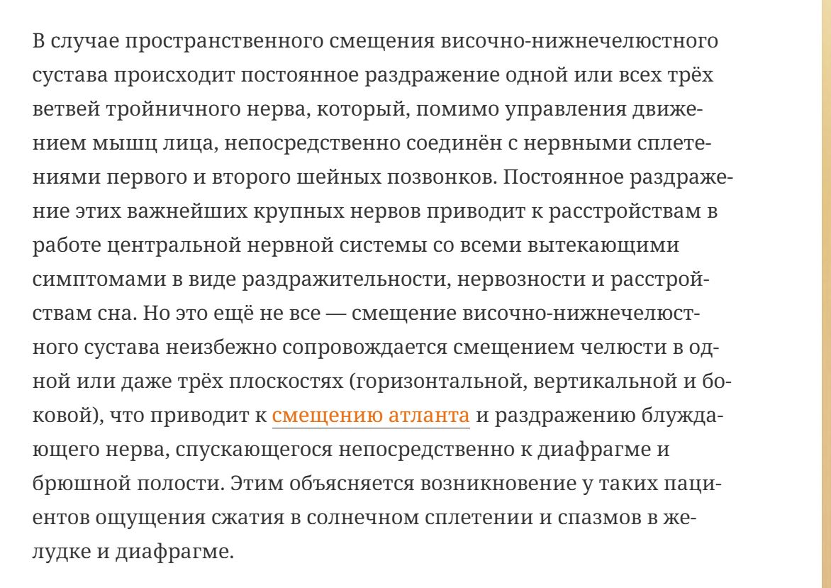 >>1631033 Я не оп, у меня даже близко не как у него. У меня в одном ухе писк тинитуса и он усиляется при жевании + иногда болит под ухом и низом виска, всё. Никаким спортом я никогда не занимался, травм и искривлений нет. В детстве начала хуёво открываться челюсть и щелкать а сейчас в 34 года видимо после миллиардов раз жеваний хавки тригеррнул этот самый больной сустав и пошло.